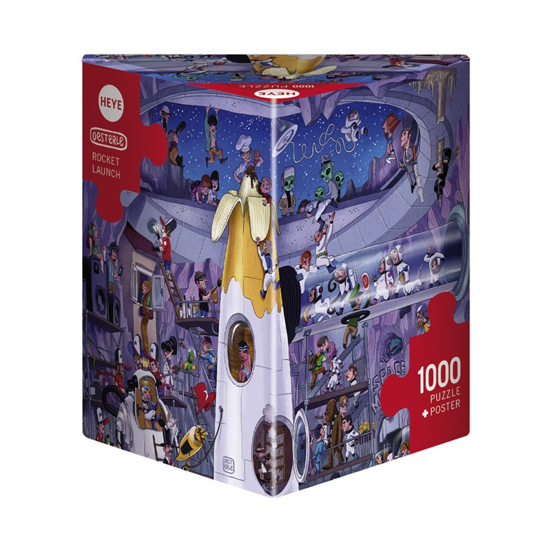 En su primera ilustración para rompecabezas, Uli Oesterle escoge los viajes espaciales y reúne todo lo que esté remotemente relacionado a estos durante el ingenioso lanzamiento del cohete.