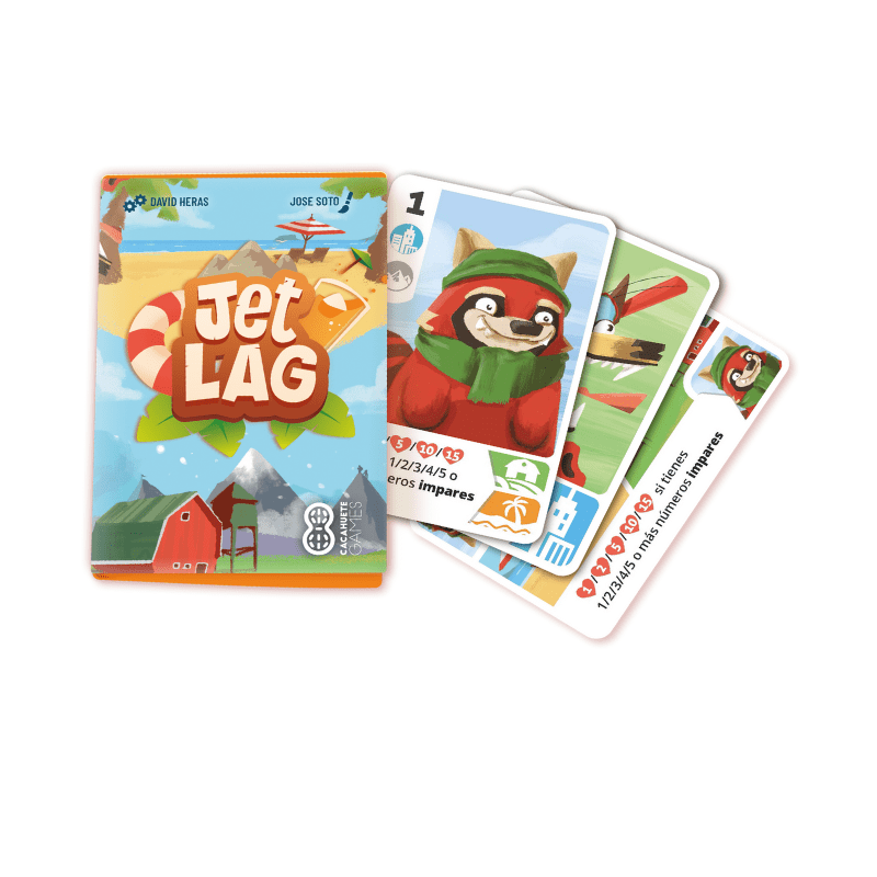 ¿Con ganas de viajar? Necesitamos que los turistas lleguen a sus destinos favoritos para disfrutar de las vacaciones. ¡Haz las maletas y prepárate para el viaje! Jet Lag es un juego de mesa de 18 cartas para dos jugadores donde deberemos combinar los diferentes turistas y destinos de la mejor manera posible para conseguir la mayor puntuación