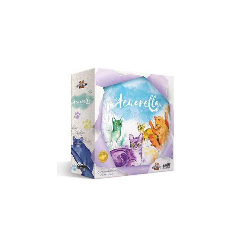 Acuarella es un juego competitivo en el que colocarás fichas de poliominó con preciosas ilustraciones de gatos. Debes añadir estas fichas a tu tablero siguiendo las reglas de colocación, intentando conseguir la mayor cantidad de pigmentos posible colocando las fichas contiguas en las combinaciones correctas. ¡