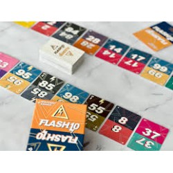 Flash 10 es un juego de cartas ágil y rápido en el que los jugadores intentarán colocar las cartas en orden numérico, pero todos al mismo tiempo. Si eres el más rápido y habilidoso ¡serás el vencedor! El mazo incluye 120 cartas, veinte de las cuales muestran una tormenta eléctrica y las otras cien están numeradas del 0 al 99. Cada carta que termina en 0 o 5 muestra un rayo. Alguien baraja el mazo y, a continuación, cada jugador recibe diez cartas boca abajo, que coloca en fila frente a sí. Jugando simultáneamente y lo más rápido posible, los jugadores descubren estas cartas (sin reordenarlas), luego empiezan a coger cartas de una en una de las que están esparcidas por el centro de la mesa y las colocan sobre una de las diez cartas que tienen delante, creando así pilas de cartas. Si un jugador roba una carta de tormenta, puede colocarla en cualquier pila. En cuanto un jugador tiene diez cartas numéricas en orden ascendente de izquierda a derecha, grita "¡Alto!" y termina la ronda. Si acierta, gana 10 puntos, más 2 puntos por terminar la ronda. Cada jugador obtiene puntos por el número de cartas en orden empezando por su pila izquierda. Además, cada carta con un rayo (en orden o no) vale 1 punto, mientras que cada carta con una tormenta eléctrica vale -1 punto. A continuación, los jugadores barajan las cartas y comienzan otra ronda. Gana el que primero llegue a 50 puntos o más.