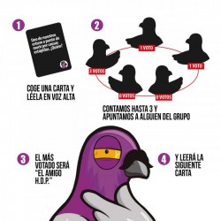 Es un juego para perder viejas amistades y quedar mal con completos desconocidos. En este juego de preguntas, podrás decirle a tus amigos lo que siempre pensaste de ellos pero nunca te atreviste a decir. Con una mecánica tan sencilla, como generadora de conflictos. El jugador en turno lee la premisa y todos a la cuenta de 3 deberán señalar a una persona. Esa persona será la ganadora de la ronda pero quizá no la más contenta con el resultado.