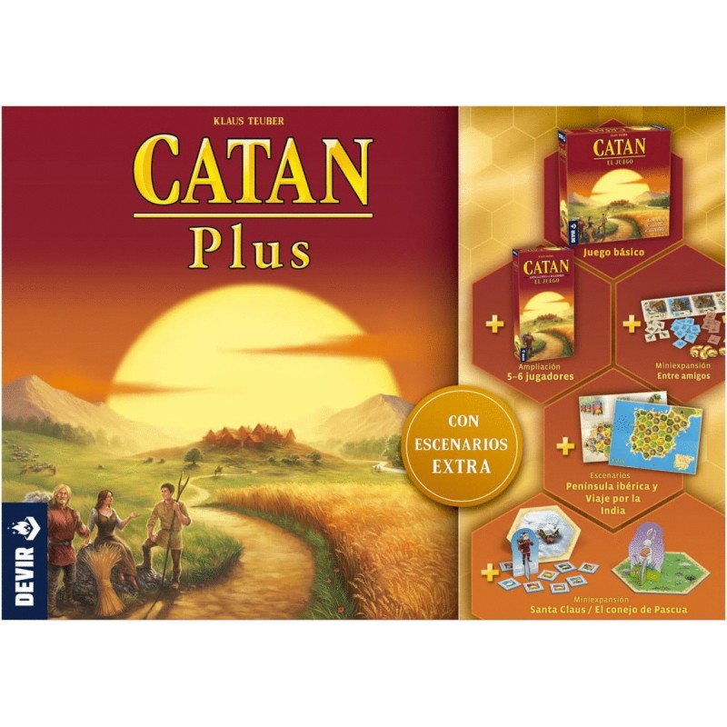 ¡La versión más completa de Catan del mercado! No dejarás nadie fuera con Catan Plus: con la combinación del juego básico y su ampliación podrás jugar con hasta 6 jugadores. Enriquece además la experiencia con sus mini expansiones
