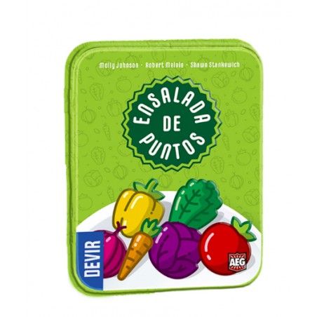 Ensalada de puntos es un juego de cartas ágil, rápido y totalmente adictivo, donde en cada turno tenemos que tomar una decisión. Al robar una carta, ¿quieres usarla para puntuar las cartas que ya tienes o prefieres sumarla a tu colección de verduras?