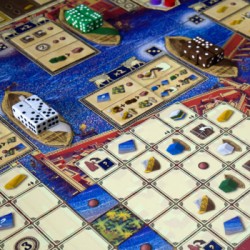El juego cuenta con 2 tableros de juego de doble cara para adaptarse a las diferencias entre los recuentos de jugadores. El tablero en sí presenta 5 regiones, cada una vinculada a un dado de color específico. Hay 3 distritos de construcción, 1 distrito de templos y 1 distrito portuario.