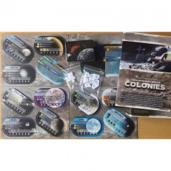 Terraforming Mars: Colonies , una expansión de Terraforming Mars que se puede jugar solo con el juego base o con cualquier combinación de expansiones, te permite visitar el sistema solar exterior. Cuenta con fichas de colonias donde puedes construir colonias y enviar tu flota comercial. También incluye nuevas tarjetas y corporaciones.